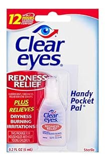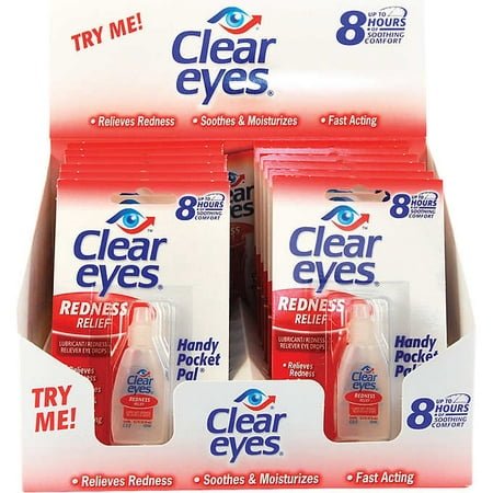 Clear Eyes Redness Relief 0.2 oz bottle 12 ct Handy pocket pal Relieves redness Soothes and moisturizes Fast acting Up to 12 Hours of Soothing Comfort Relieves: Dryness Burning Irritations Redness Relief Sterile