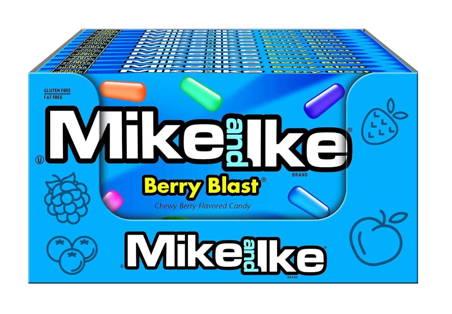 All your favorite berry flavors in one theater box. Mike and Ike Berry Blast Chewy Candies are a brightly colored and tasty treat. Have enough on hand because you will have to share. Just Born a family-owned candy manufacturer has been in business since 1923. They make some of the most beloved and iconic candy brands including MIKE AND IKE Original Fruits chewy assorted fruit flavored candies which were introduced in 1940. Flavors include Wild Berry Blue Raspberry Strawberry Blueberry and Peach Berry. Kosher Certified Parve Gluten Free Follow All City Candyon Social Media: Facebook|Instagram|YouTube|Pinterest Nutrition Ingredients: Sugar corn syrup modified food starch fruit juice from concentrate (pear orange strawberry cherry lime lemon) contains less than 2% of the following: citric acid malic acid fumaric acid sodium citrate natural and artificial flavors dextrin confectioner s glaze carnauba wax medium chain triglycerides red 40 blue 1 yellow 5 (tartrazine). Ingredients and nutr
